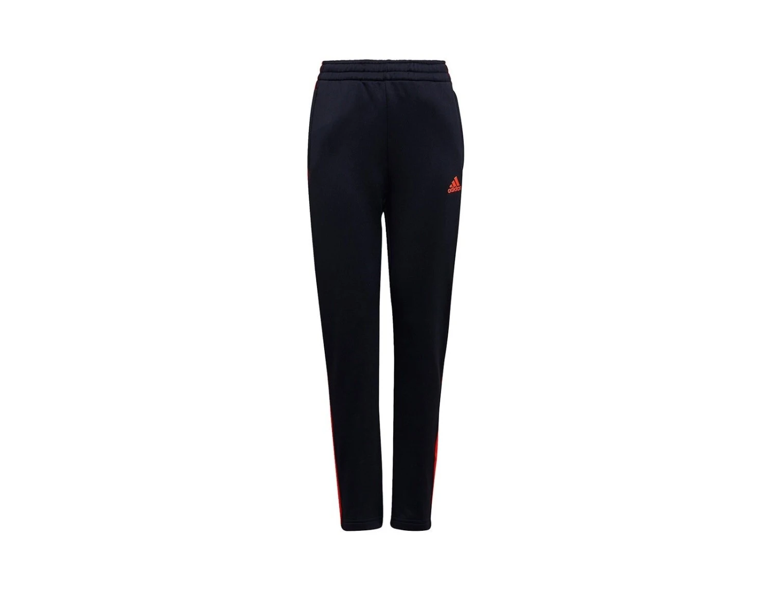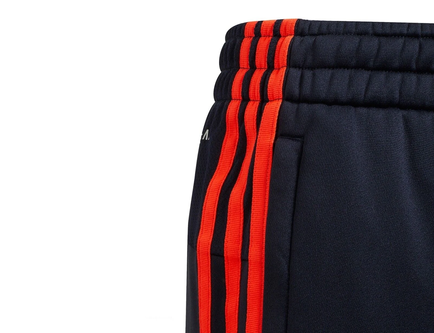 Die dunkelblaue adidas AEROREADY 3-Stripes Trainingshose für Jungen ist aus atmungsaktivem und feuchtigkeitsableitendem AEROREADY Material, welches den Körper trocken hält. Das angeraute French Terry Innenfutter ist weich. Die Trainingshose hat Seitentaschen mit Reißverschlüssen und einen elastischen Bund mit Kordelzug. Orangefarbene Details.