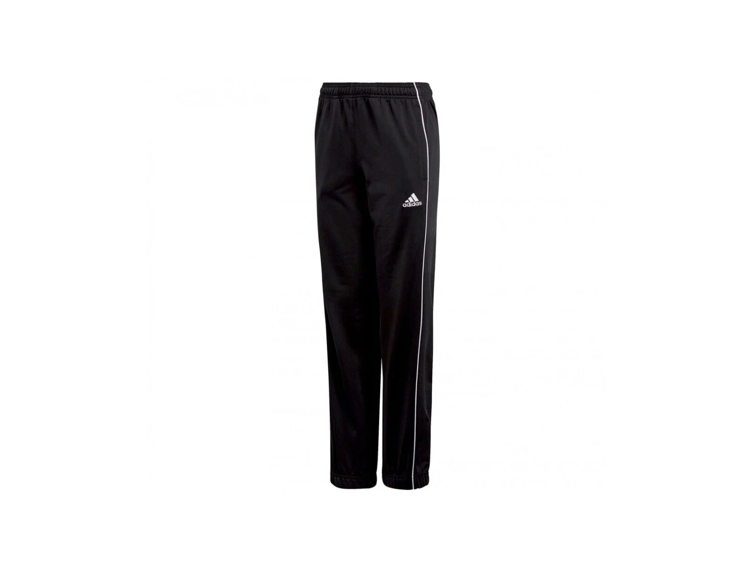 Schwarze Trainingshose für Kinder aus der Fußballserie von adidas Core18. Diese Hose ist aus 100% Polyester und hat ein Fleece Innenfutter. Die Hose hat gerade Beine, Seitentaschen und einen elastischen Bund. An den Seiten ist ein weißer Streifen.
