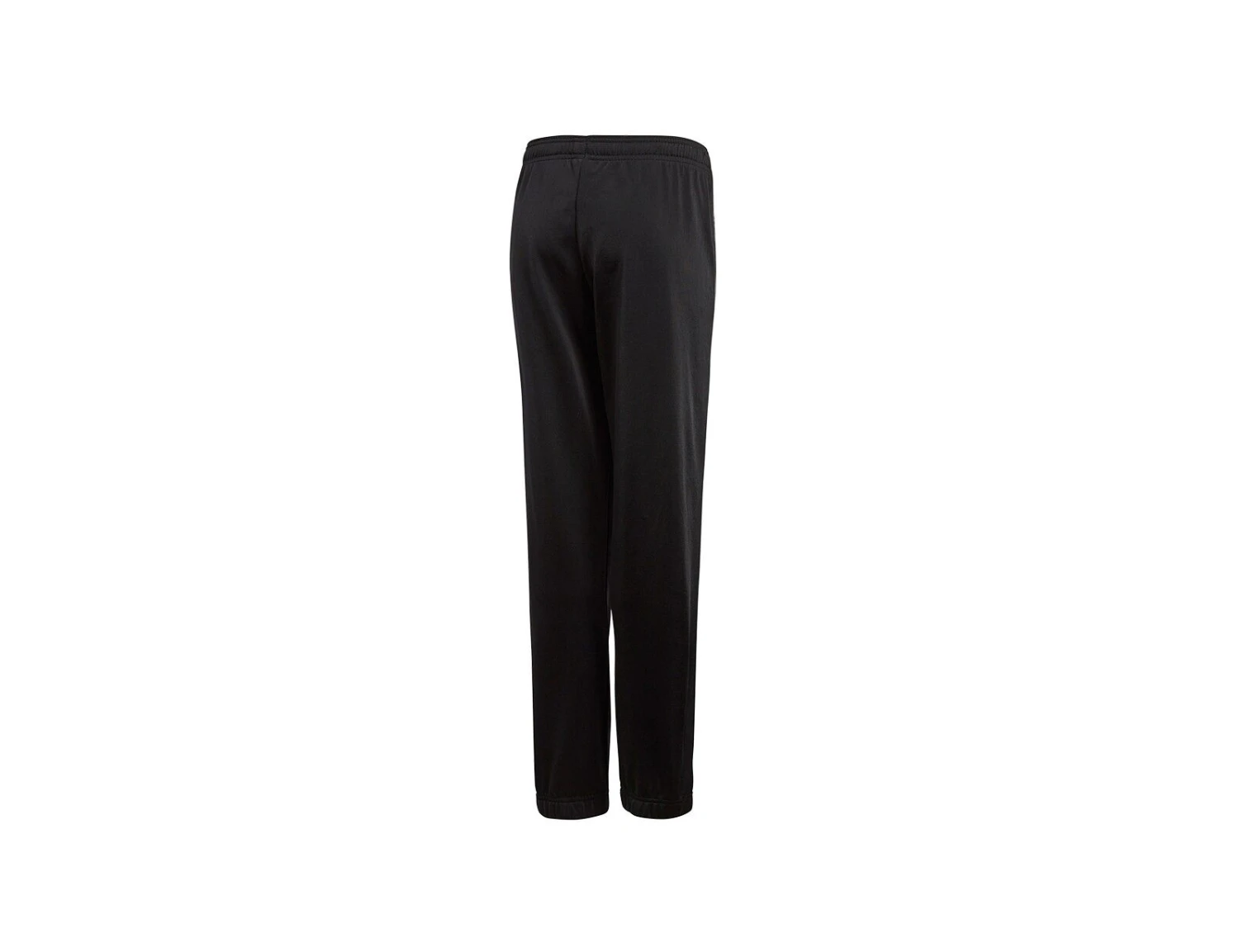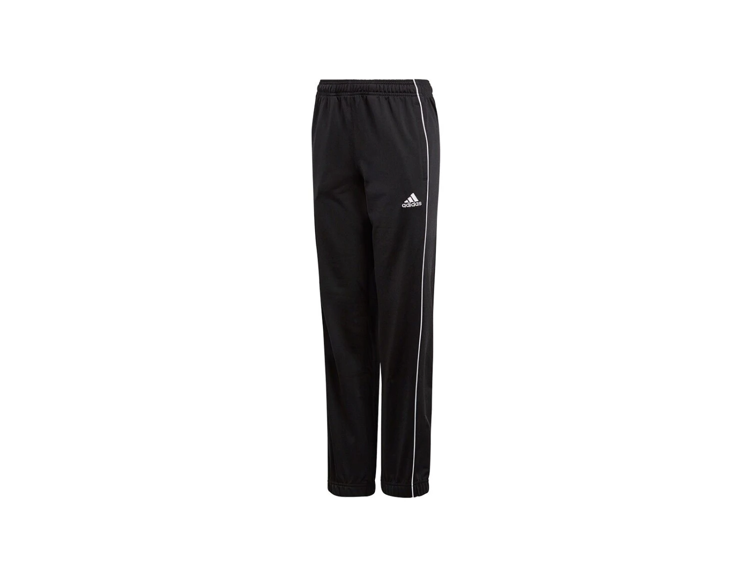 Schwarze Trainingshose für Kinder aus der Fußballserie von adidas Core 18. Diese Hose ist aus 100% Polyester und ist Mesh gefüttert. Die Hose hat gerade Beine, Seitentaschen und einen elastischen Bund. An den Seiten ist ein weißer Streifen.