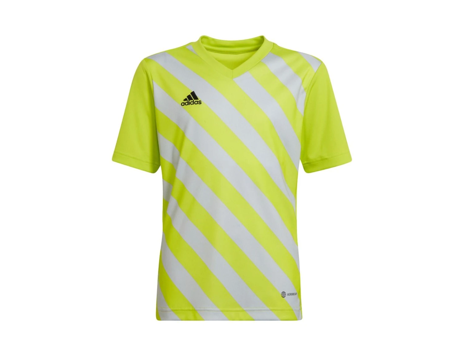 Das grün-gelbe adidas Entrada 22 Graphic Kinder Fußballtrikot hat diagonale Streifen. Das Trikot ist aus feuchtigkeitsregulierendem AEROREADY Material, welches den Körper trocken hält. Das Kindertrikot hat einen V-Ausschnitt und ist aus recyceltem Material.