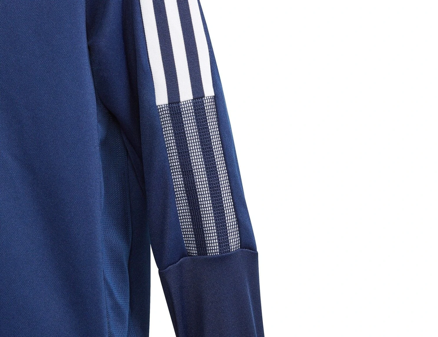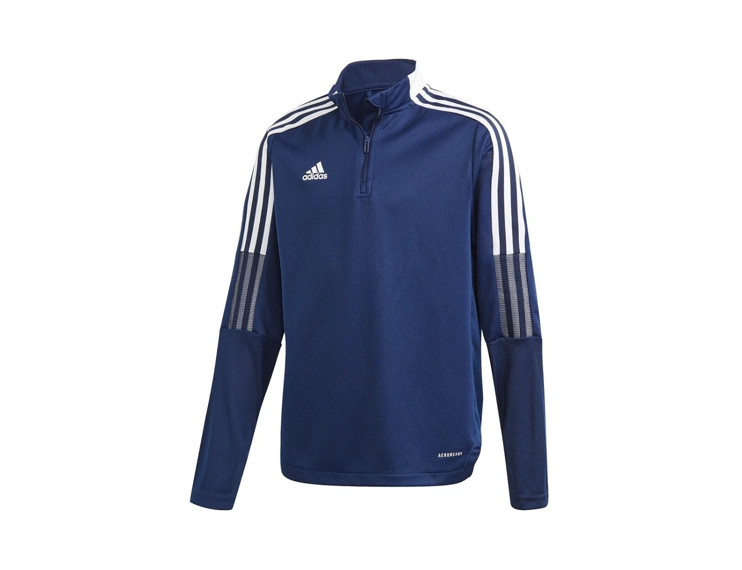 Das dunkelblaue adidas Tiro 21 Trainingsshirt für Kinder ist aus angenehmem Polyester, hat einen Stehkragen und einen kurzen Reißverschluss auf der Vorderseite. Auf der Vorderseite ist das adidas Badge of Sports Logo und auf den Ärmeln sind die 3 adidas Streifen. Die AEROREADY Technologie hält den Körper trocken.