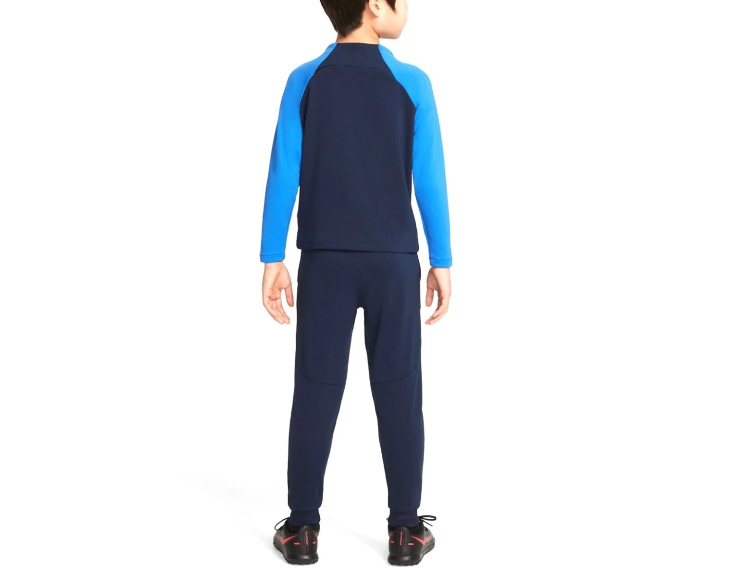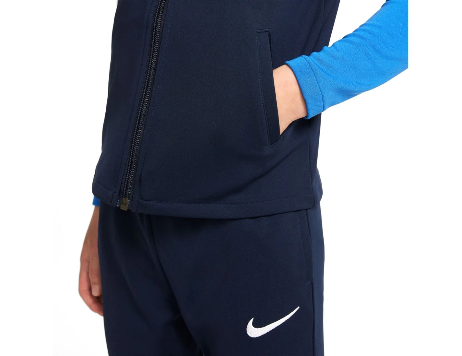 This blue Nike Academy Pro Kids tracksuit has a sporty style and a comfortable wearing comfort. The tracksuit consists of a jacket and pants that you can wear together or separately. The jacket has a full zip, the Nike logo is embroidered on the front. The pants have an elastic waistband. The tracksuit is made of comfortable polyester.