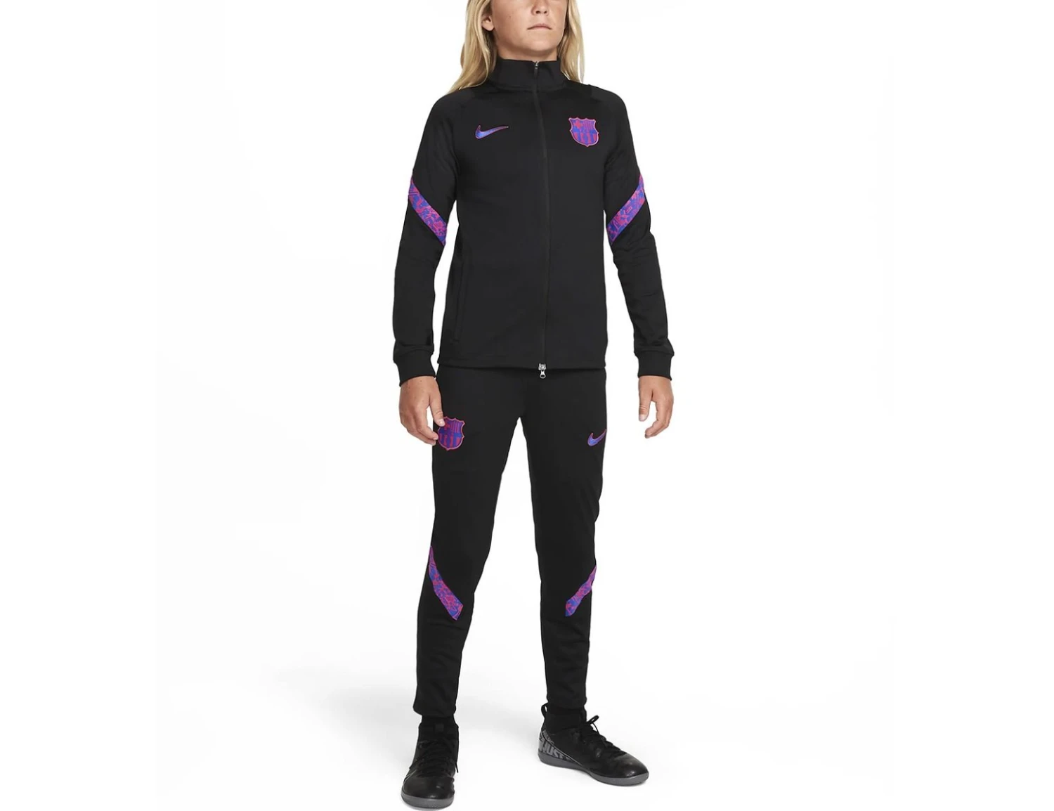 The FC Barcelona Strike Kids‘ Tracksuit features a zip up jacket and adjustable pants for versatile styling. Sweat-wicking Dri-FIT fabric has just the right amount of stretch to help keep you dry and comfortable as you warm up. Zippers at the bottom of the legs allow you to change quickly when it’s time to get into the game. The set consists of a jacket and trousers.