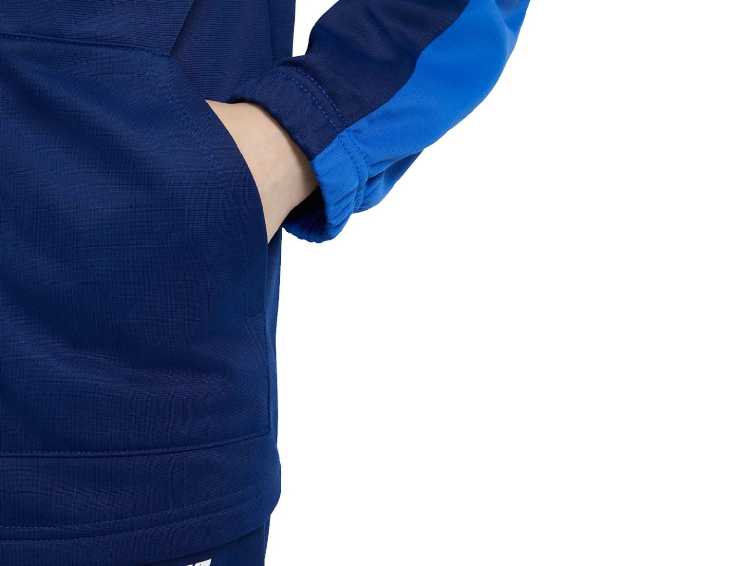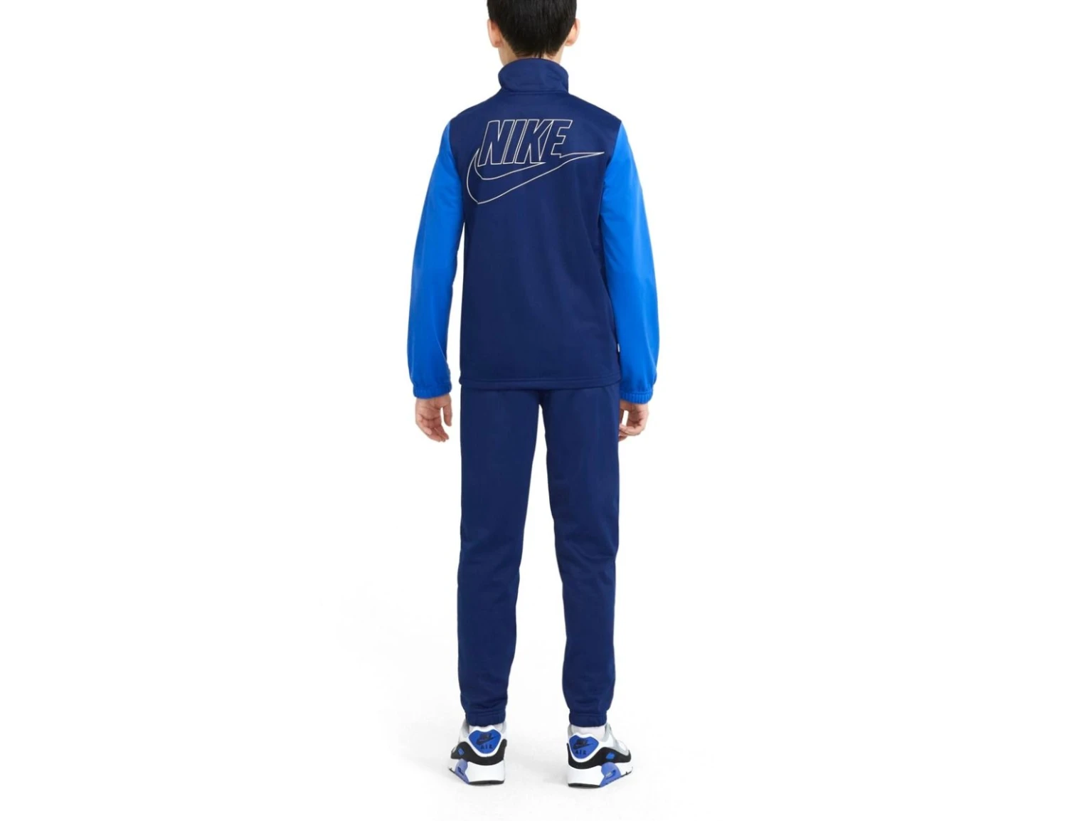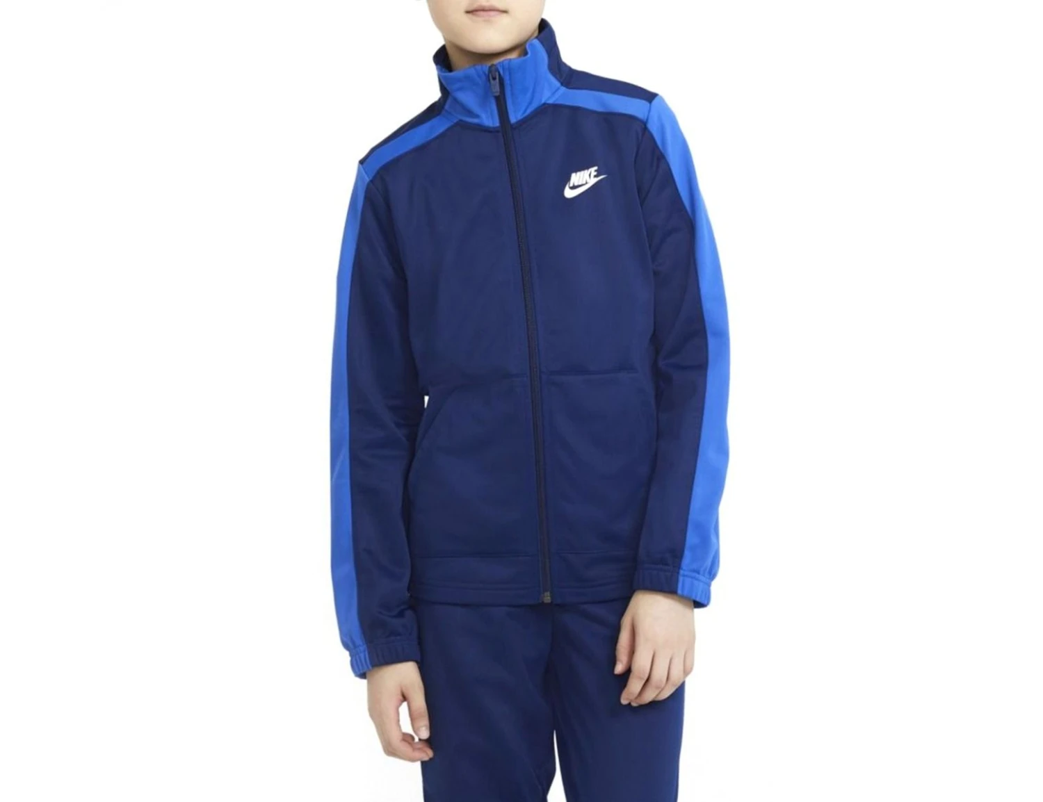 Der blaue Nike Sportswear Kinder Trainingsanzug hat einen Retro Stil. Der Trainingsanzug besteht aus einer Jacke und einer Hose. Die Jacke hat einen durchgehenden Reißverschluss und das Nike Logo ist auf die Rückenseite gedruckt. Die Hose hat einen elastischen Bund. Der Trainingsanzug ist aus bequemem Polyester.